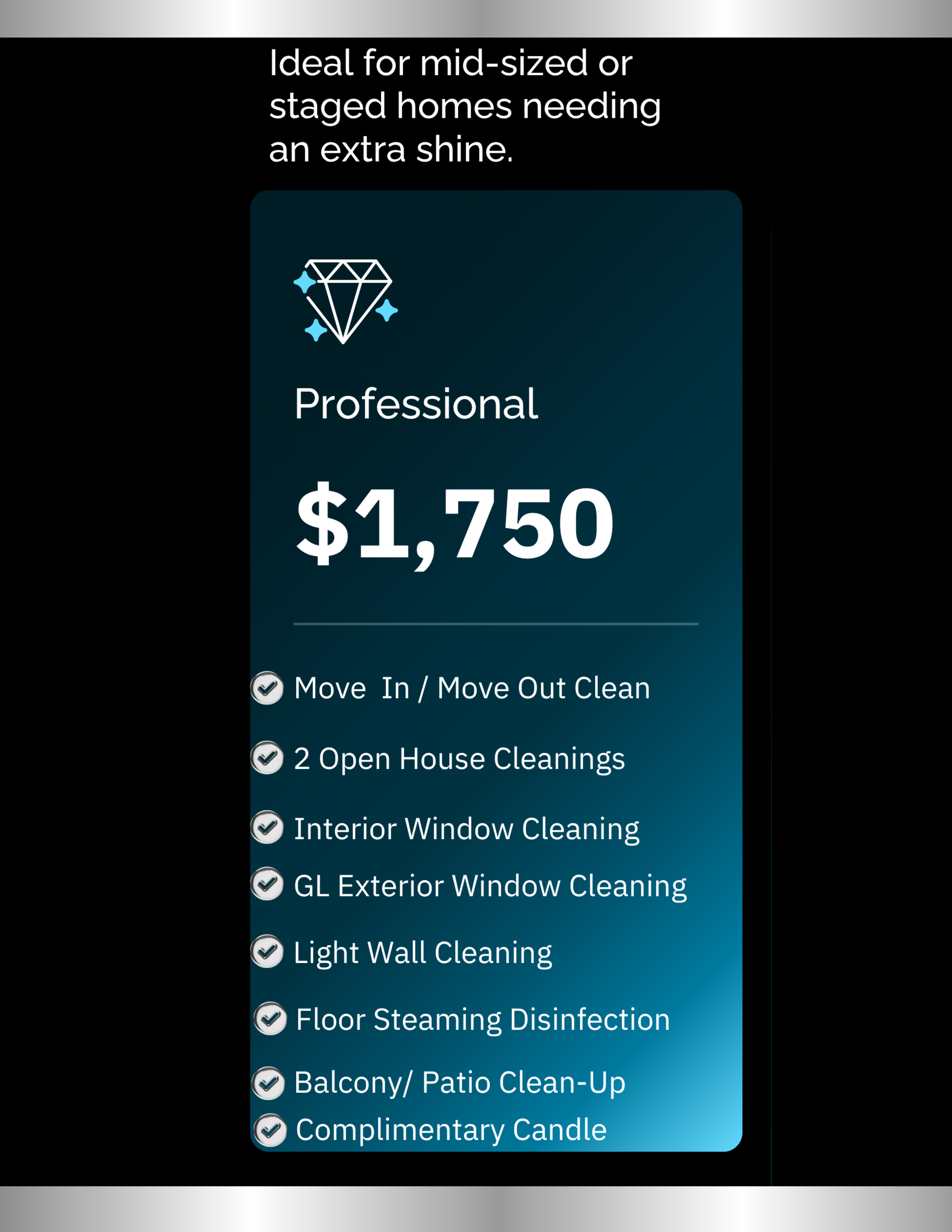 For properties that require enhanced detailing, the Professional Package ($1,750) adds even more care — including two open house cleanings, ground-level exterior window cleaning, light wall cleaning, floor steaming, and balcony or patio cleanup. A complimentary Pure Zen candle is also included, offering your clients a luxurious final touch.
