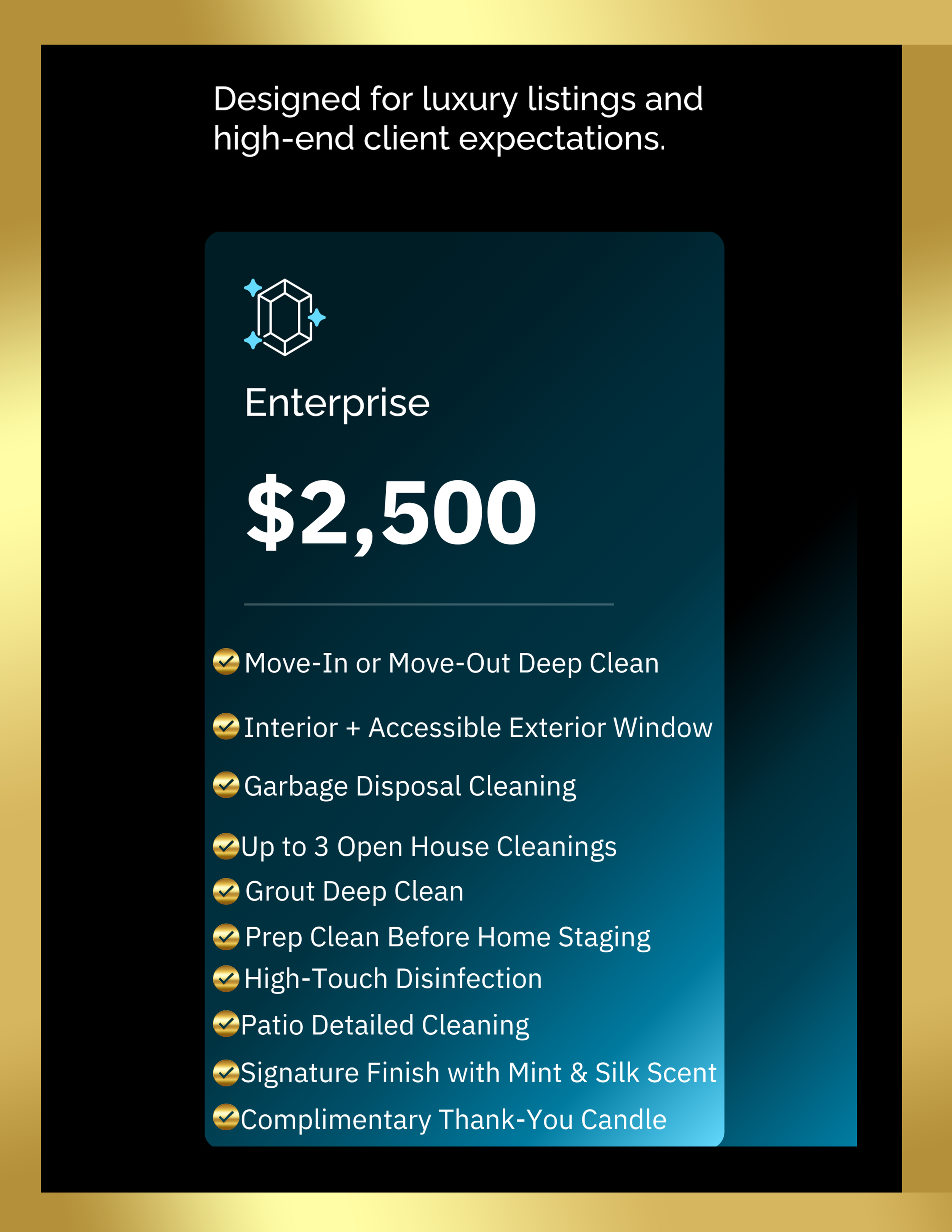 For luxury listings and high-end expectations, our Enterprise Package ($2,500) delivers unmatched excellence. This premier service includes everything in the Professional Package plus grout deep cleaning, garbage disposal detailing, and prep cleans before home staging. It also covers up to three open house cleanings, extended window care, patio detailing, and a Signature Scent finish with an elegant thank-you candle — making your client’s experience truly unforgettable.