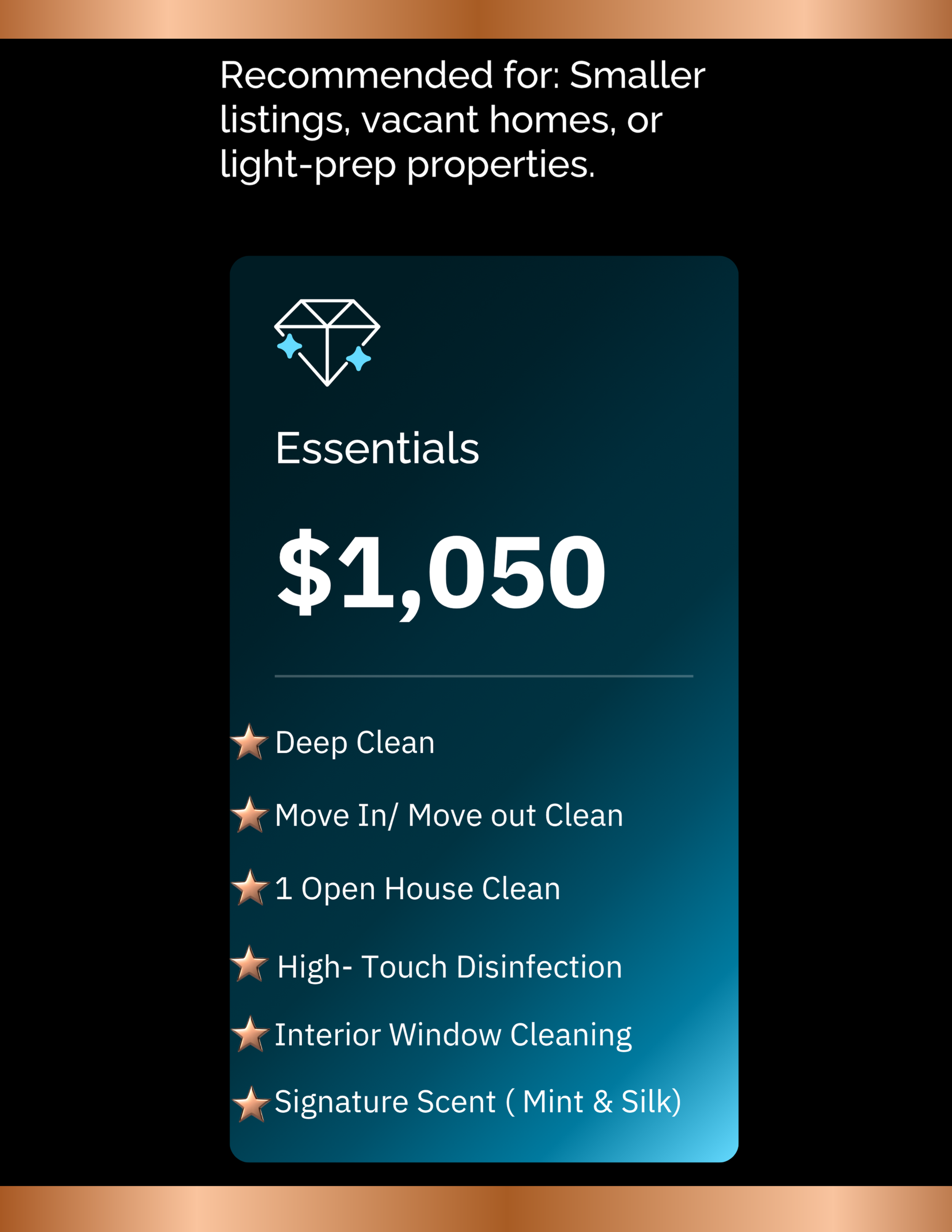 Our Essentials Package ($1,050) is ideal for smaller listings or vacant homes that need a clean and polished presentation. It includes a full deep cleaning, one open house cleaning, high-touch disinfection, interior window cleaning, and a refreshing finish with our signature Mint & Silk scent.